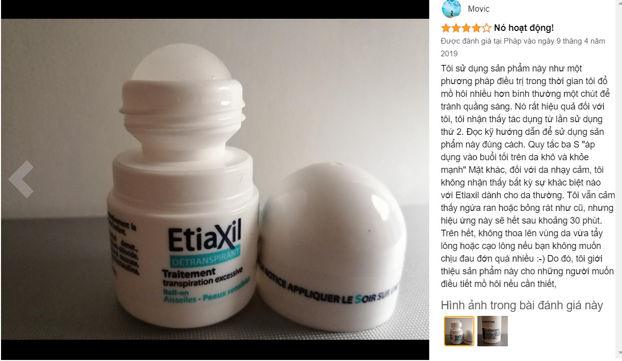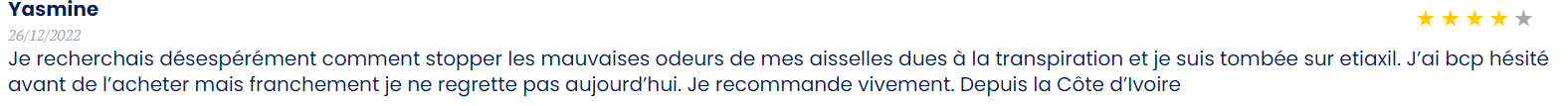 Yasmine: Tôi đang tuyệt vọng tìm cách khử mùi mồ hôi do đổ mồ hôi ở nách và tôi tìm thấy Etiaxil. Tôi đã do dự rất nhiều trước khi mua, Tôi không hối hận về ngày hôm nay. Tôi nông nhiệt đề cử …. Từ Bờ Biển Ngà