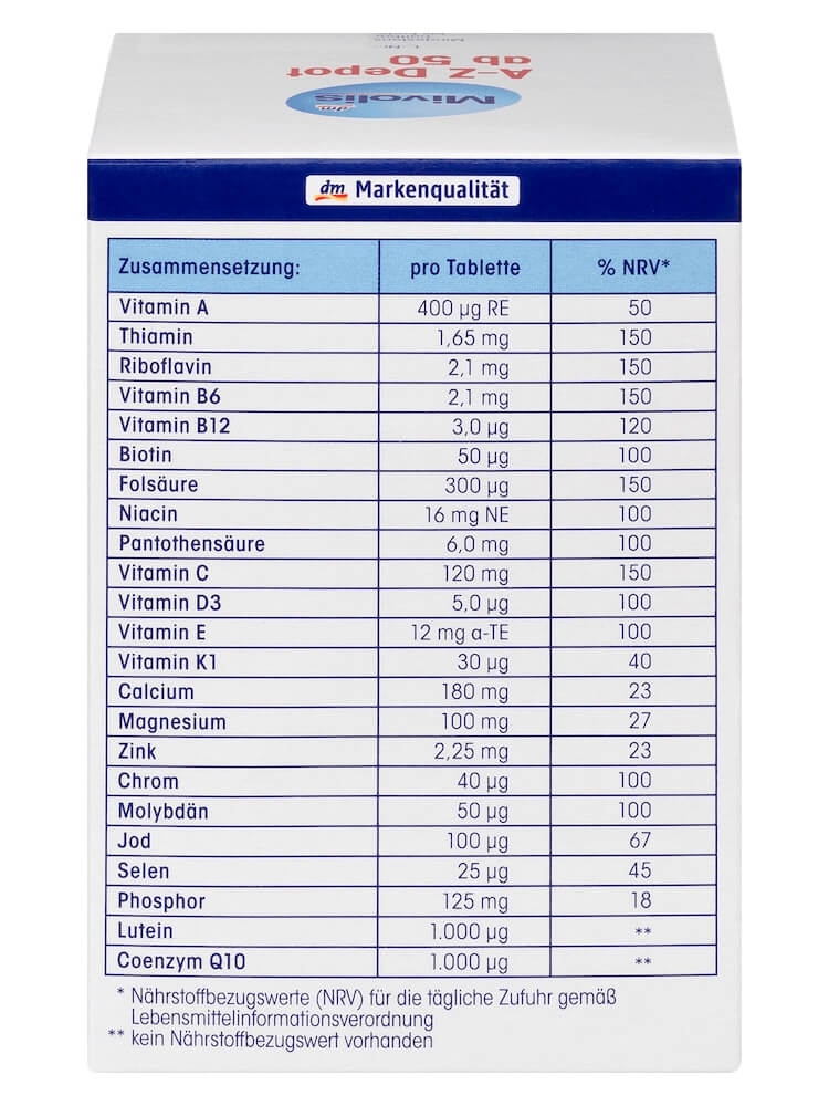 Thông tin dinh dưỡng trong Vitamin tổng hợp Mivolis A Z Depot ab 50